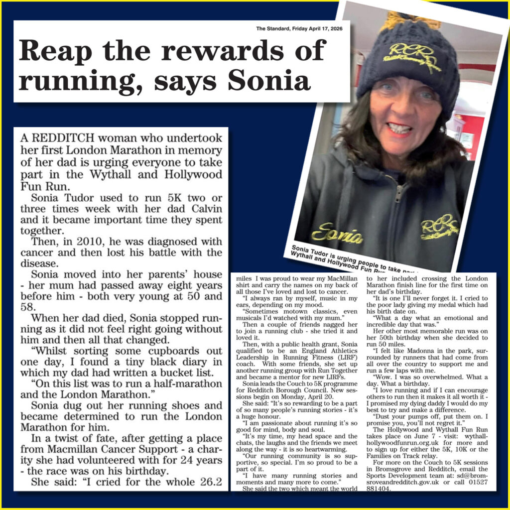Our group leader Sonia Tudor was recently interviewed about taking part in the London Marathon in memory of her dad. Sonia is also urging residents to sign up to the Wythall and Hollywood Fun run.
